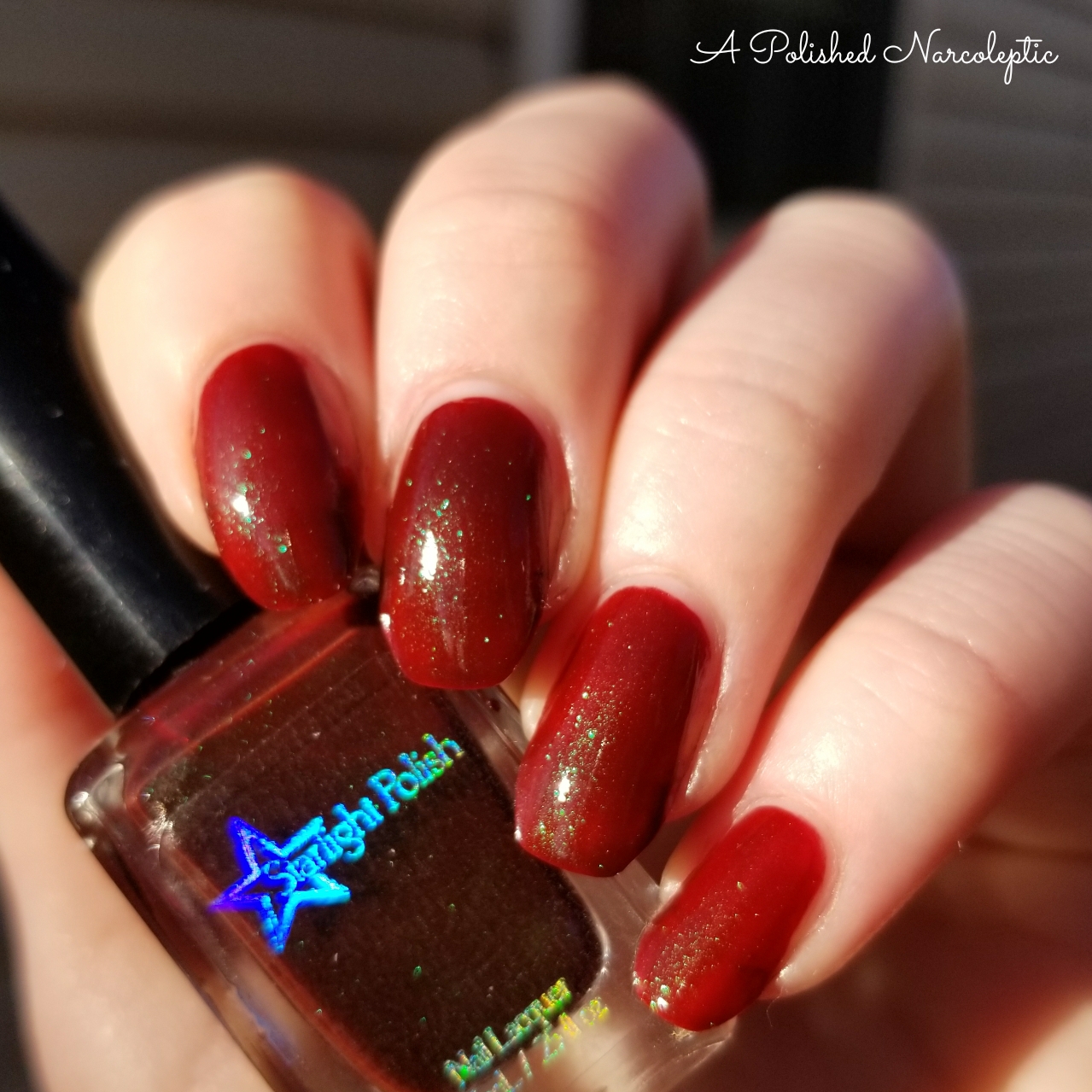 Phoenix Garnet is a dark red base with shimmer that shifts from red to gold to green, and flashes vivid red and bright green at the extremes of its color range.  It is opaque with two or three coats, but can also be layered to use less polish.